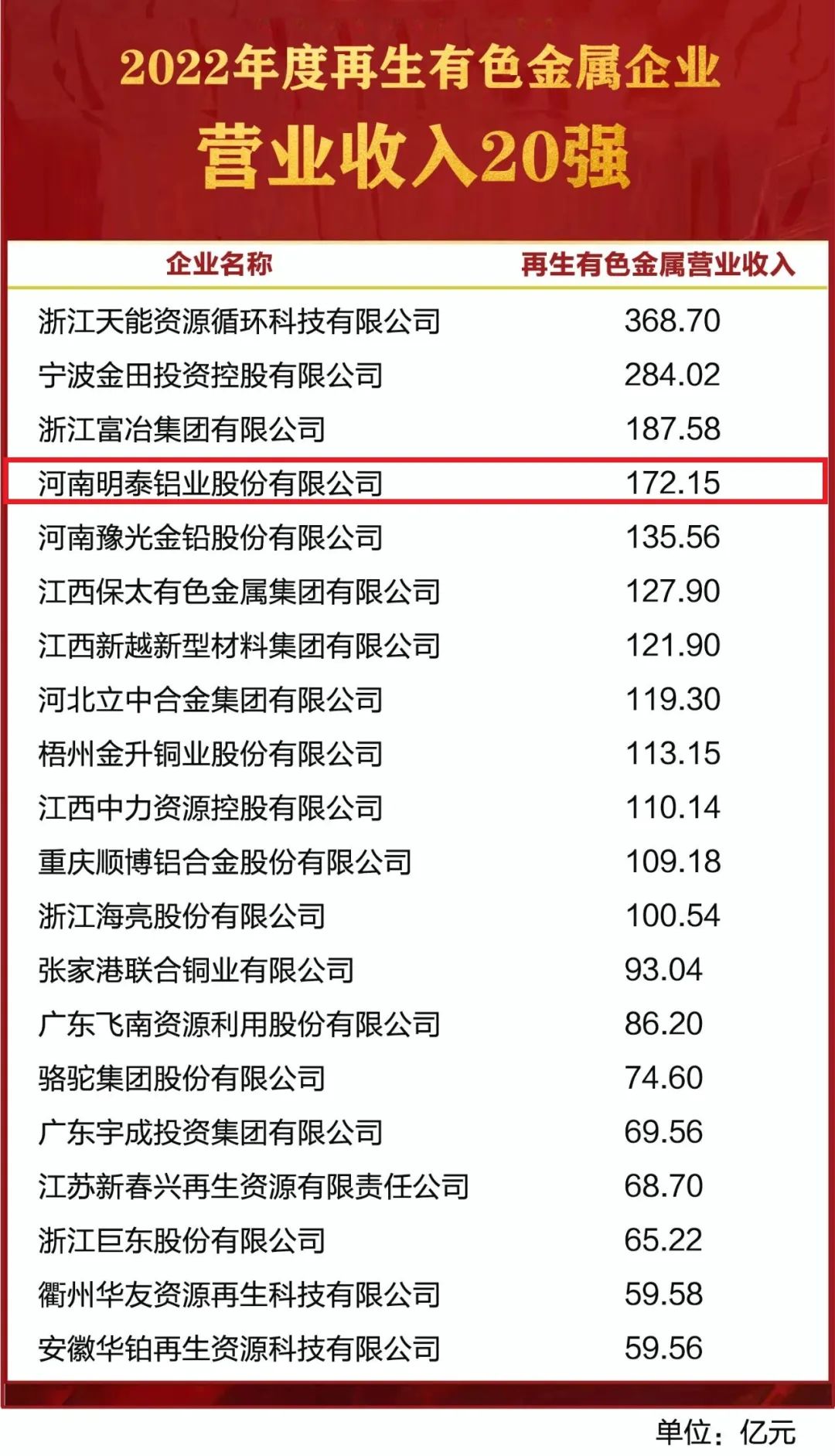 為深入貫徹黨的二十大精神,彰顯再生有色金屬企業(yè)貫徹新發(fā)展理念、實現(xiàn)高質(zhì)量發(fā)展的示范引領(lǐng)作用,再生金屬分會開展了2022年度再生有色金屬企業(yè)營業(yè)收入20強(qiáng)申報工作,經(jīng)審核、公示且無異議,現(xiàn)對2022年度再生有色金屬企業(yè)營業(yè)收入20強(qiáng)名單予以發(fā)布。2022年明泰鋁業(yè)再生有色金屬營業(yè)收入達(dá)到172.15億元,排名第4位。